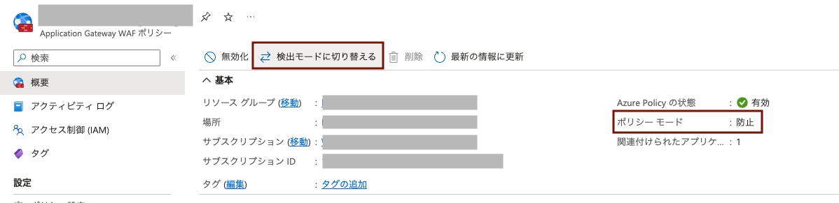ポリシー全体のモードは、 WAFポリシー画面の [基本] の箇所で確認および変更が可能です。