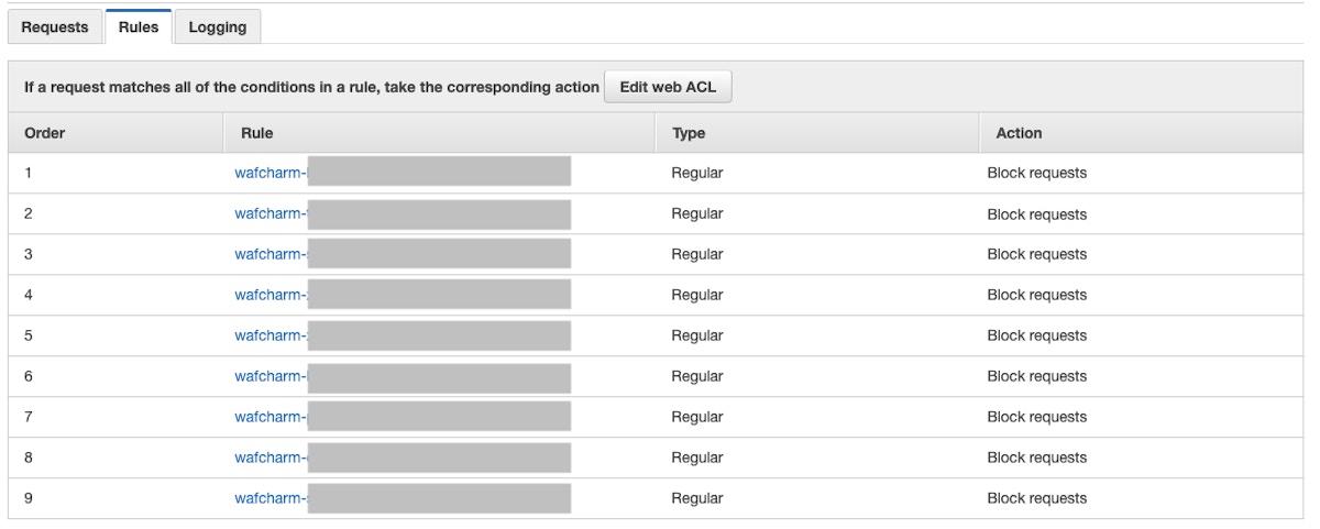 以下のスクリーンショットのように、 [wafcharm] という名前で始まるルールが適用されていれば問題ありません。