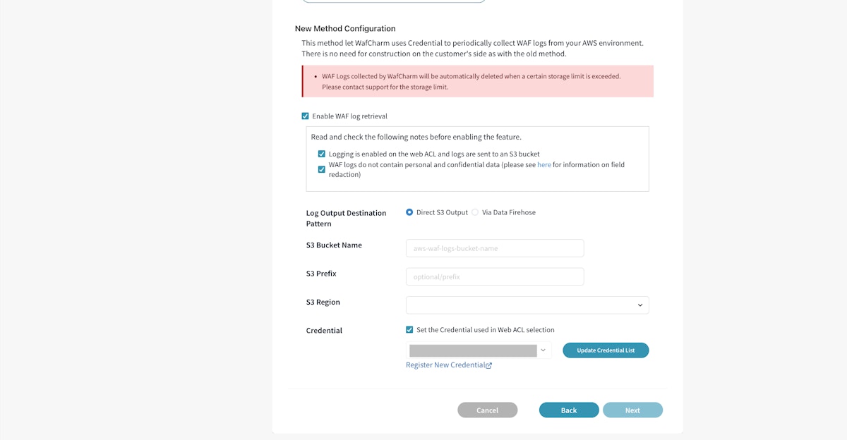 *Currently, WAF log retrieval is limited to old plan users. If you want to use the new method, please contact the WafCharm support team with details on logging configurations per WAF Config.