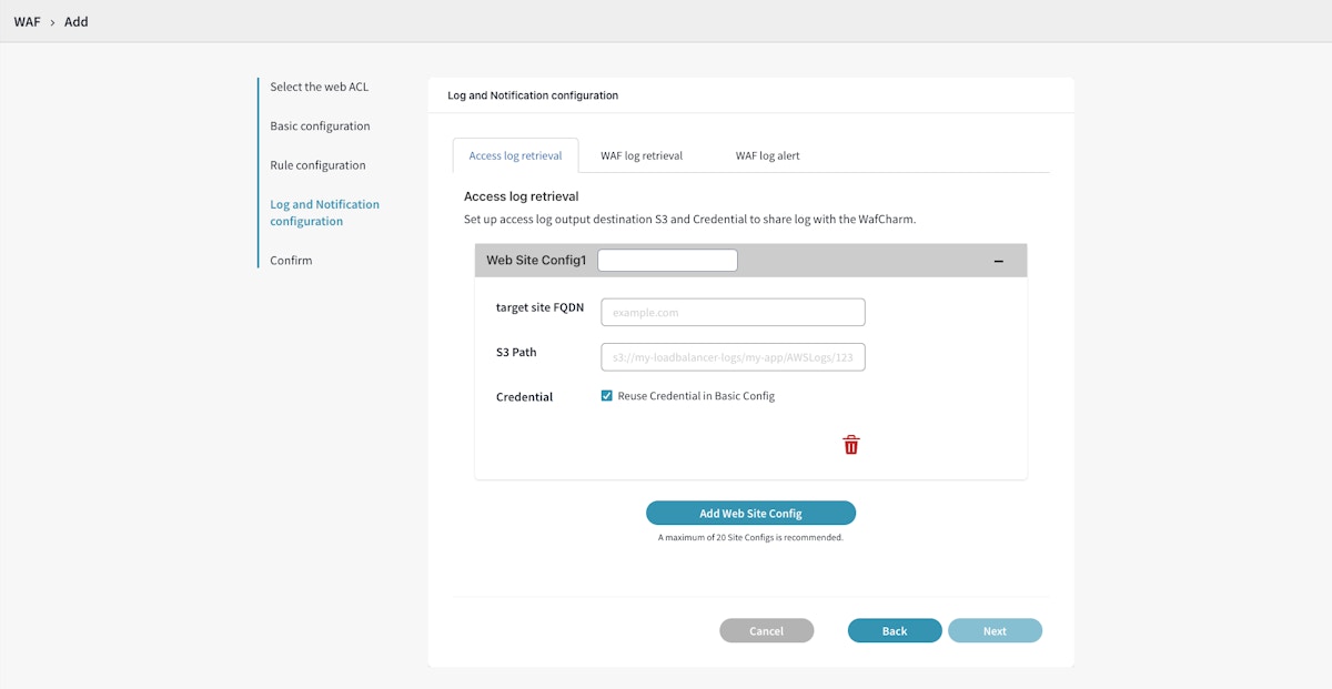 Enabling WAF log retrieval is optional. If you want to refrain from configuring this option, do not check the [Enable WAF log retrieval] checkbox under the [WAF log retrieval] tab when adding a WAF Config. In addition, please avoid configuring the old method (Lambda method).