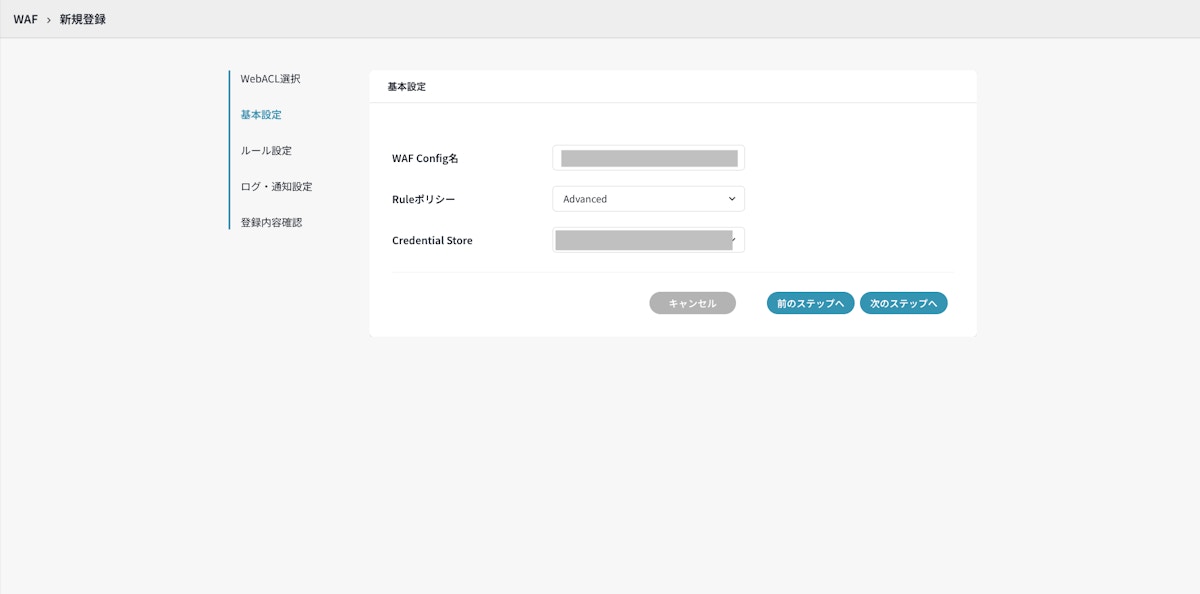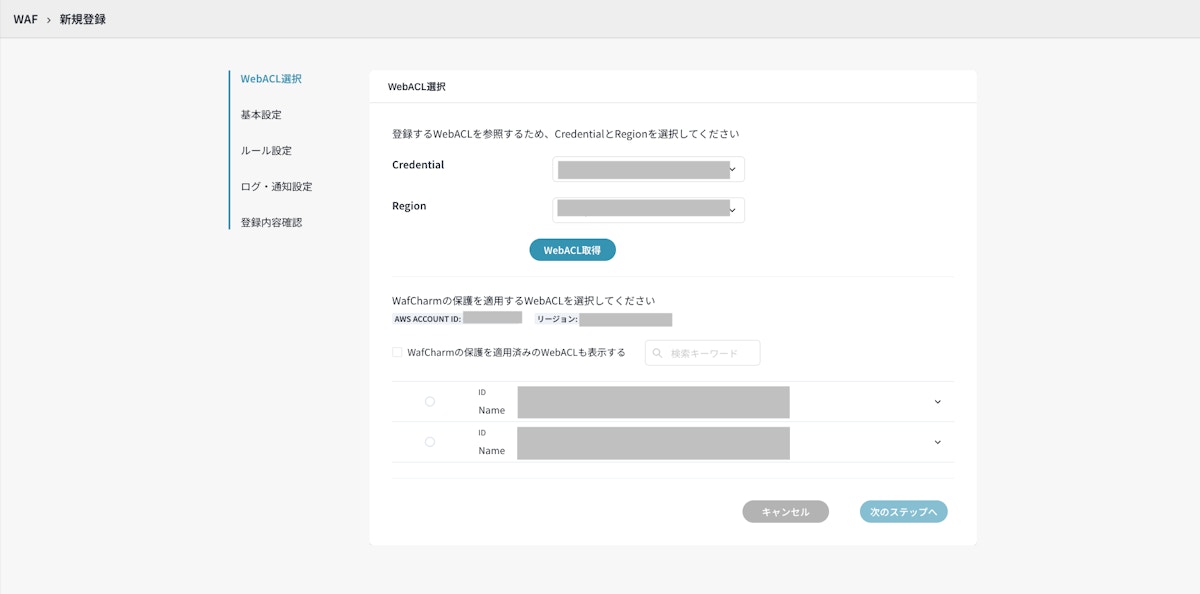 なお、WafCharm利用中のWeb ACLに対して再度新規登録の設定を行うことはできないため、WafCharm利用中のWeb ACLを選択して次のステップに進むことはできません。