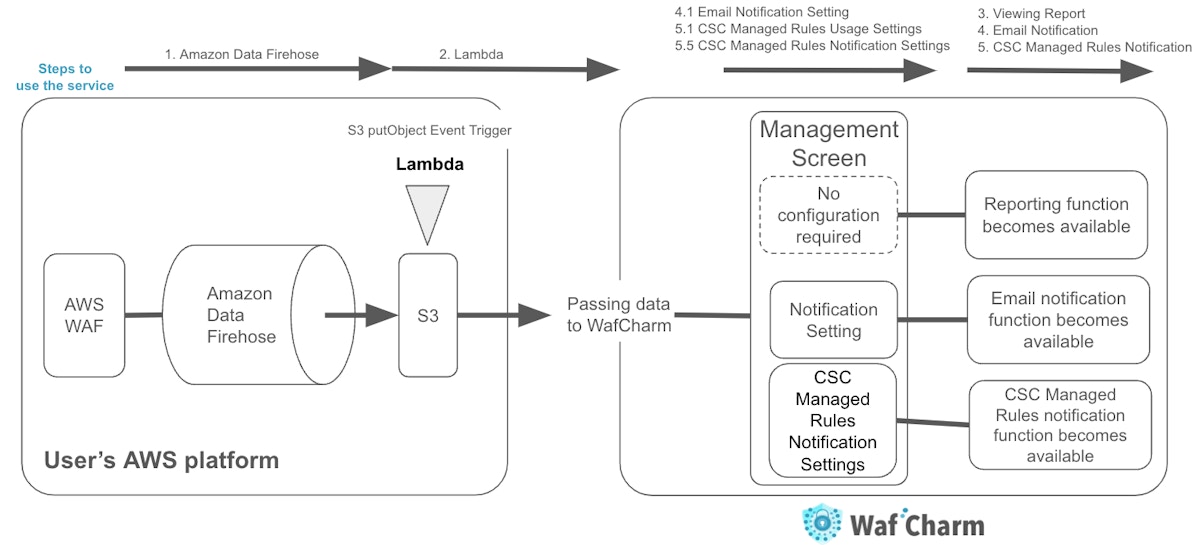 If you configure email notification settings for WafCharm rule detections on the WafCharm Console, you can use the WAF log alert (notification detection) feature. If you are using CSC's managed rules with WafCharm, you can also receive detection notifications for the detections by CSC's managed rules by turning the CSC's managed rule detection notification on.