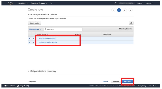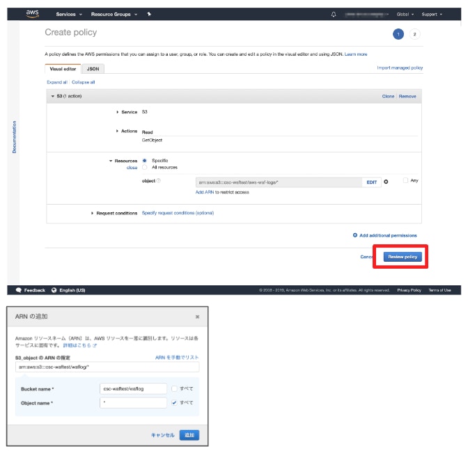 arn:aws:s3:::csc-waftest/waflog/*Write the S3 bucket path you obtained in the previous steps. The path specified under the [Resources] must end with /* .