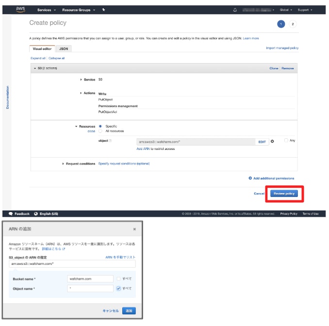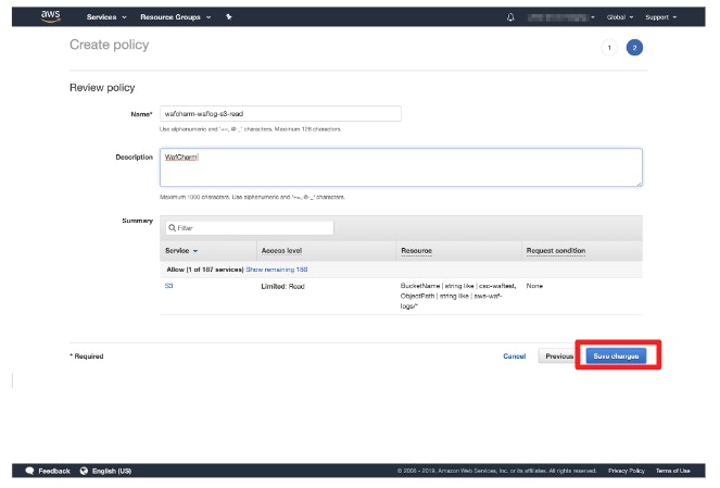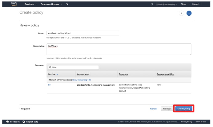 arn:aws:s3:::wafcharm.com/*Enter WafCharm's S3 bucket (as specified above) to enable WAF log transfer. The path specified under the [Resources] must end with /* .