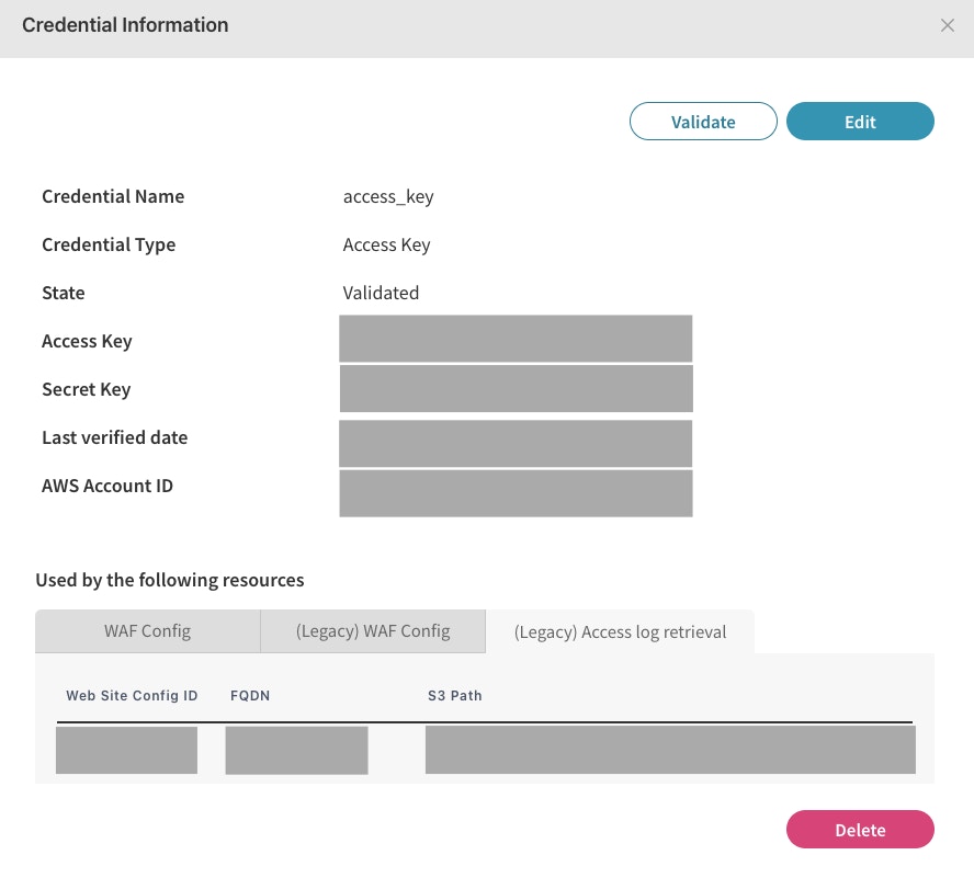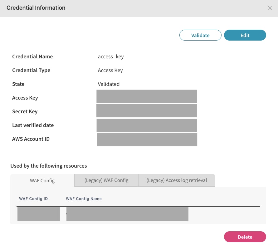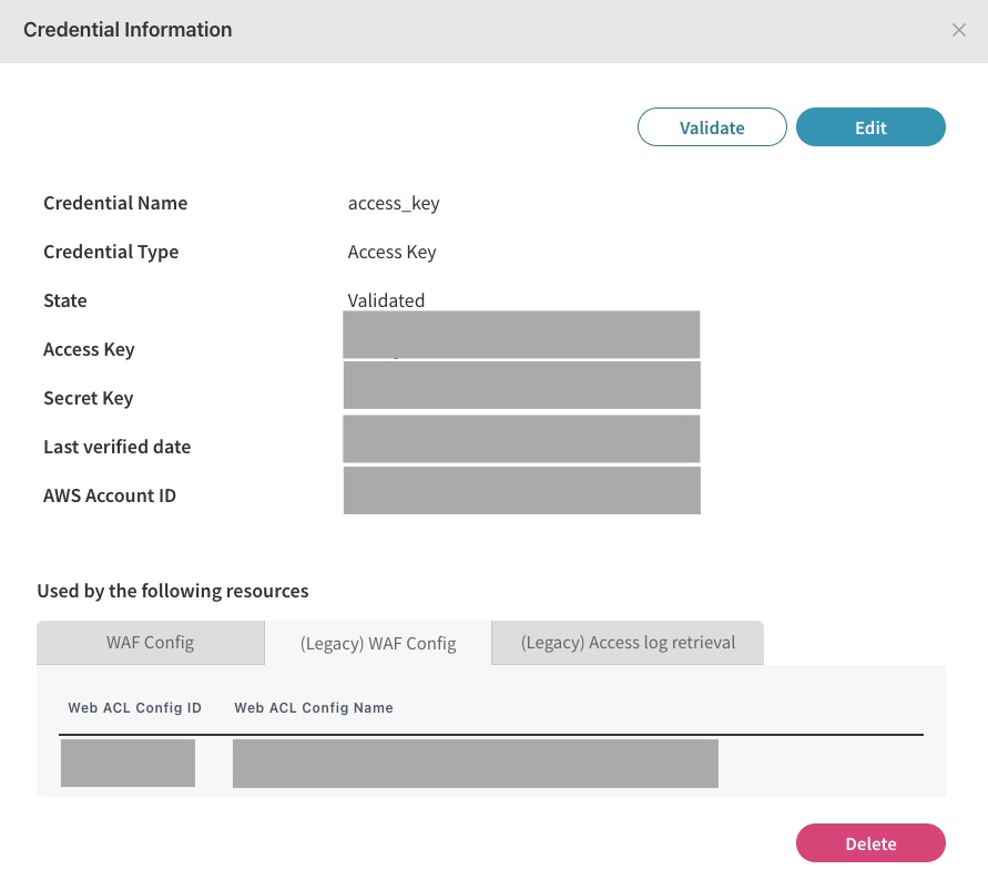 [(Legacy) WAF Config] tab under [Used by the following resources] lists the name of WAF Configs associated with the credential information.