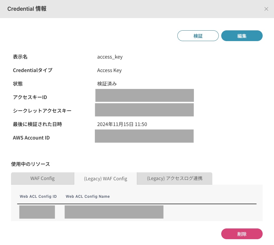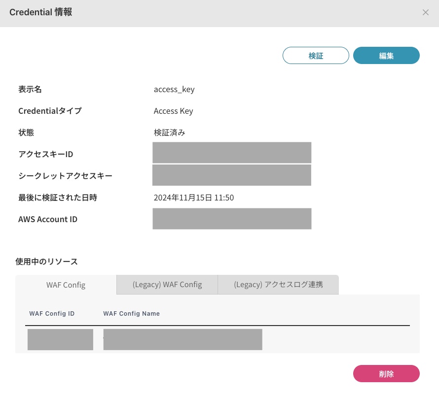 [使用中のリソース] 以下の [(Legacy) WAF Config] タブに当該のクレデンシャル情報を使用しているWAF Configの名前などが記載されます。
