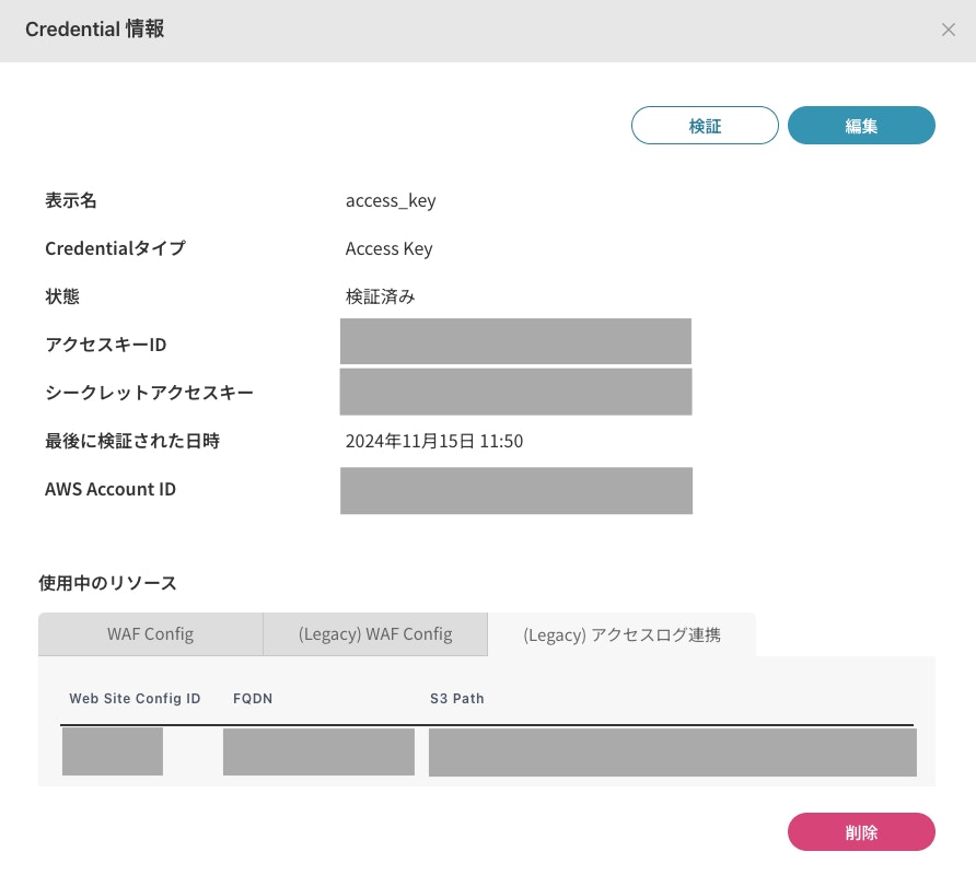 また、Legacy Ruleポリシーの場合はアクセスログ連携の設定もご実施いただきますので、[使用中のリソース] 以下の [(Legacy) アクセスログ連携] タブに当該のクレデンシャル情報を使用しているWeb Site Configの情報が記載されます。
