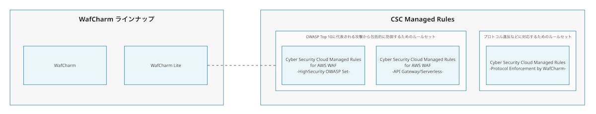 WafCharmとCSC Managed Rulesのグルーピングは異なりますが、WafCharm Liteと、OWASP Top 10に代表される攻撃から包括的に防御するためのルールセット2つのうちどちらかと併用いただくことで、CSC Managed Rulesに機能を追加できるイメージです。