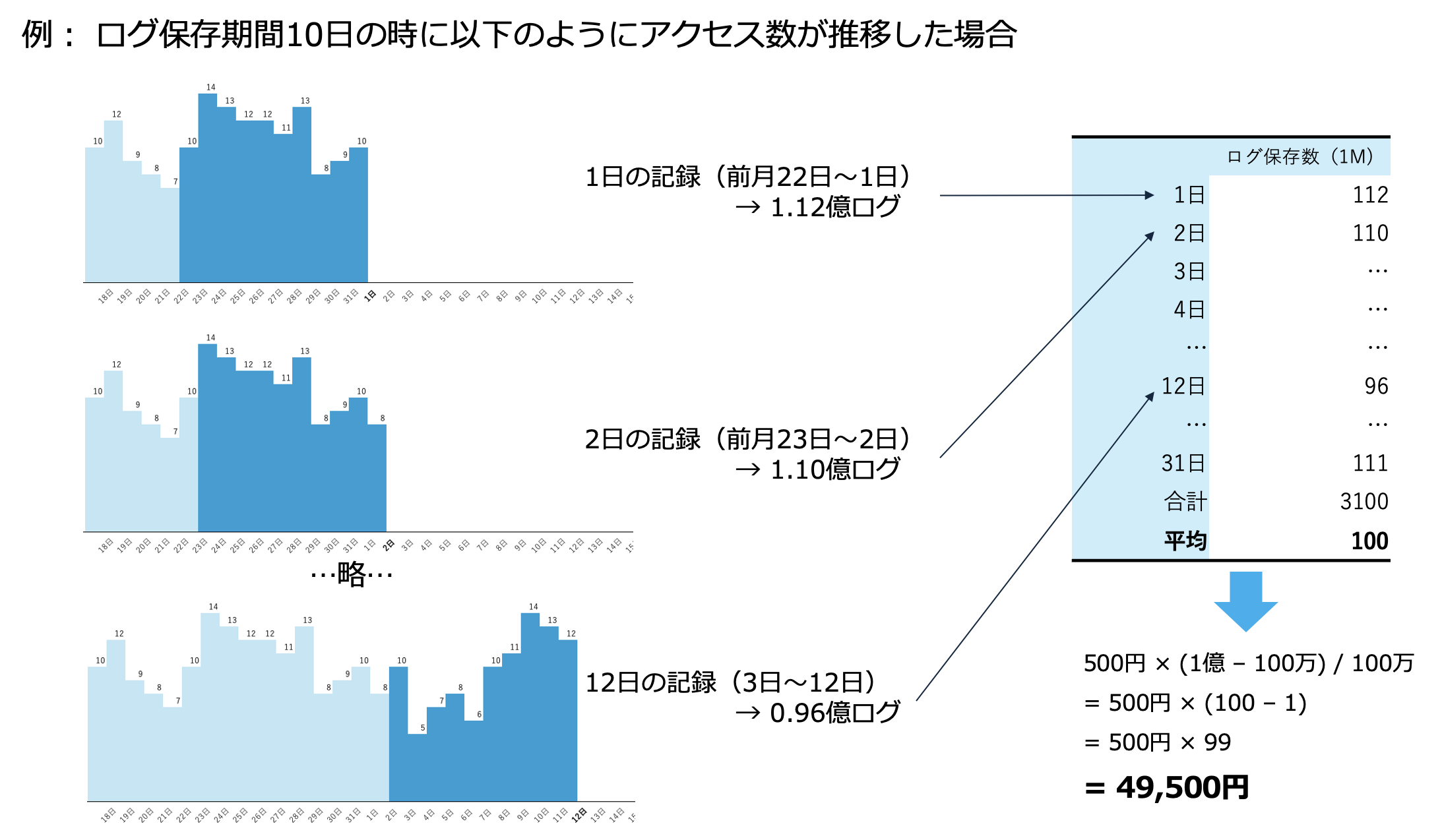 以下は、ログ保存期間が10日で指定されていた時のログ保存数記録と従量課金計算式のイメージになります。