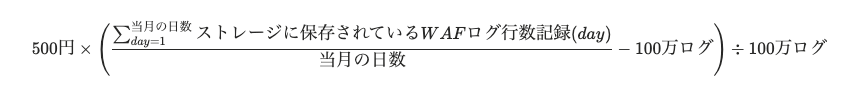 上記記載の通り、WAFログストレージに保存されているログ行数のカウントについて月間の平均数を算出し、これを元に従量課金額が決定されます。冒頭に記載の通り、WAFログの保存数はWAF Configごとに日数指定となるため、日々のログ数の推移によってストレージに保存されているログ数は変動することになりますが、これらの平均値を使用することによって、特定の日のアクセススパイクが料金に大きく影響しないようなアルゴリズムとなっています。