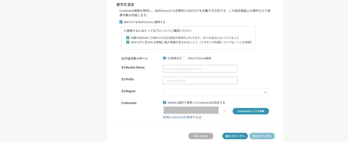CloudFrontでは、複数のアクセスログの出力方法がありますが、WafCharmでは、そのうち「S3 Legacy」にのみ対応しております。「S3 Legacy」以外のアクセスログは使用できませんのでご注意ください。