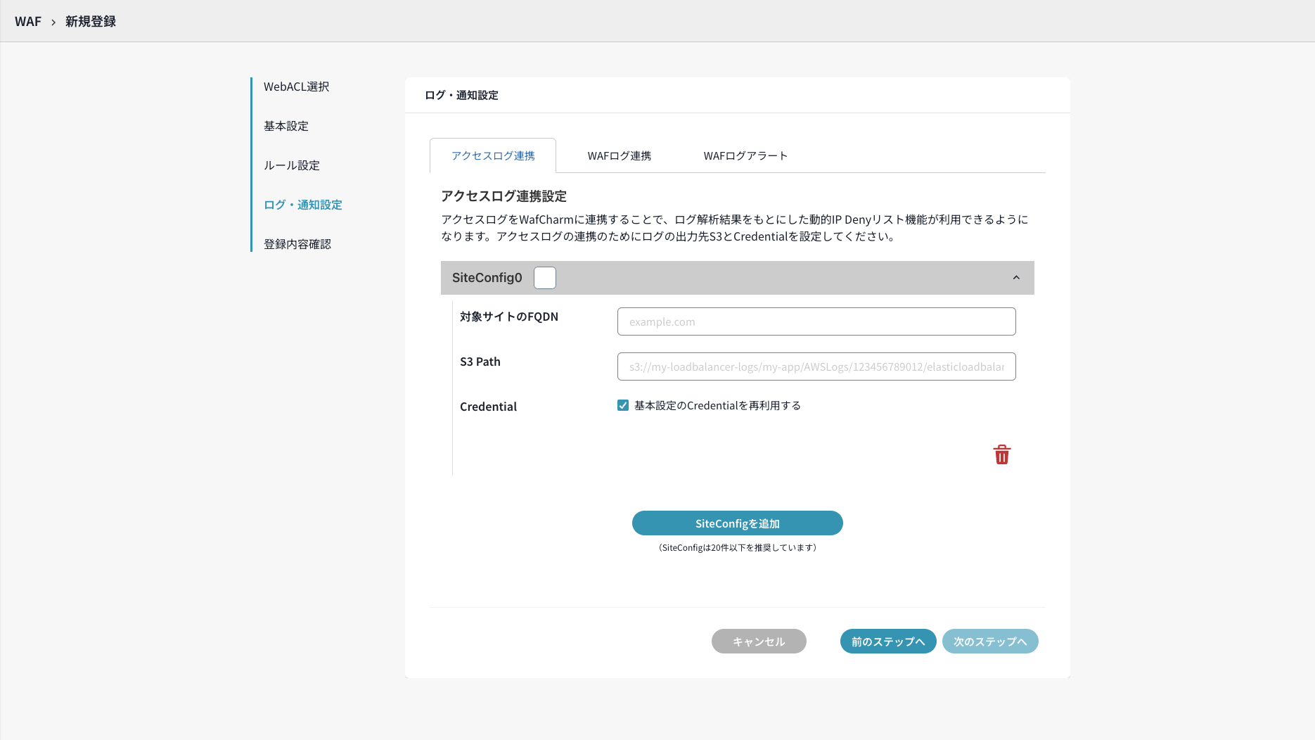 同じWeb ACLに紐づくリソース(ALBやCloudFront)が複数あり、Web Site Config(アクセスログの出力先)を複数登録したい場合には、[Web Site Configを追加] をクリックして設定項目を増やしてください。