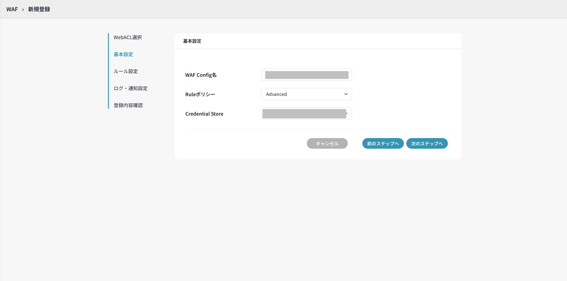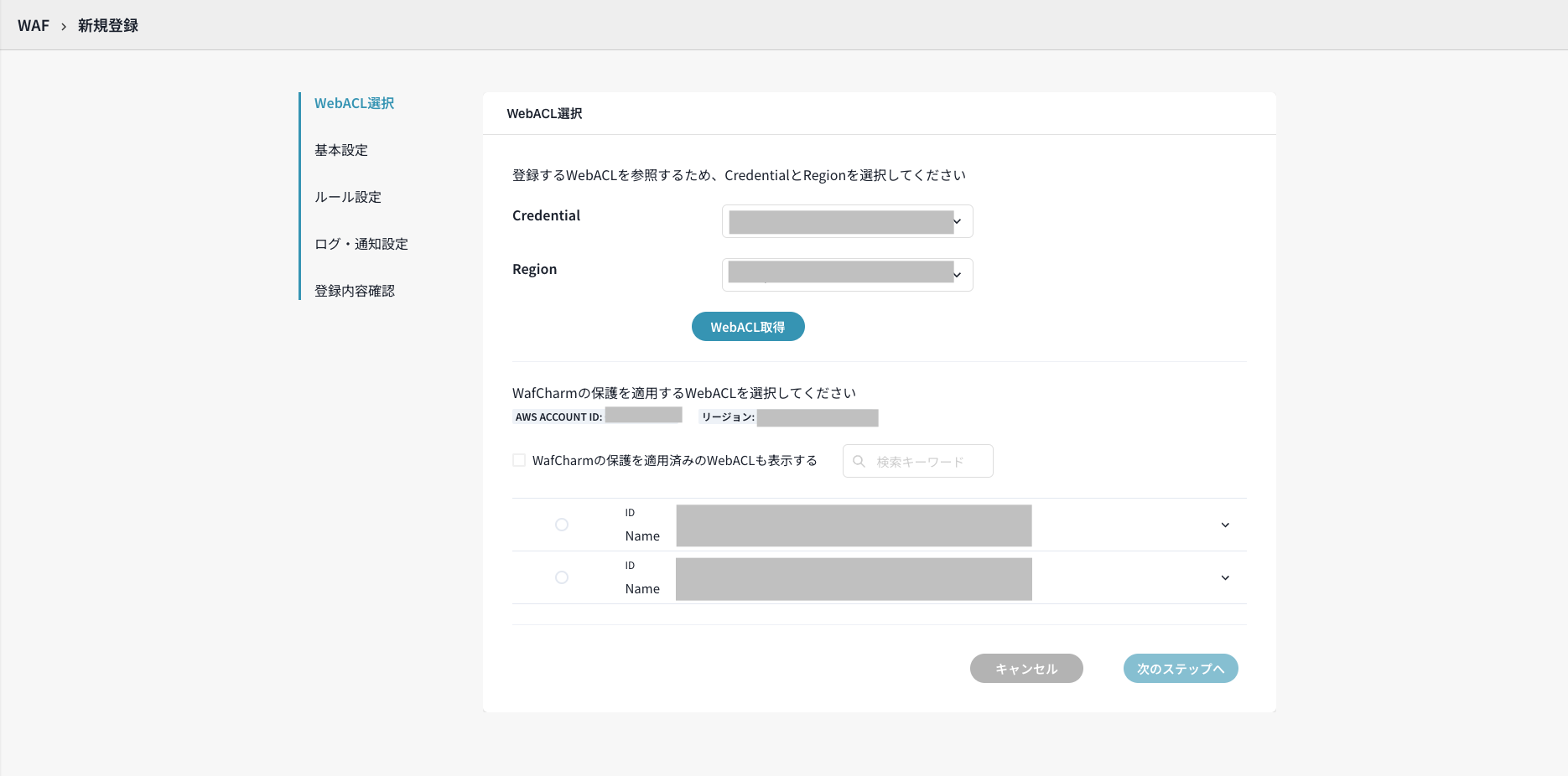 なお、WafCharm利用中のWeb ACLに対して再度新規登録の設定を行うことはできないため、WafCharm利用中のWeb ACLを選択して次のステップに進むことはできません。